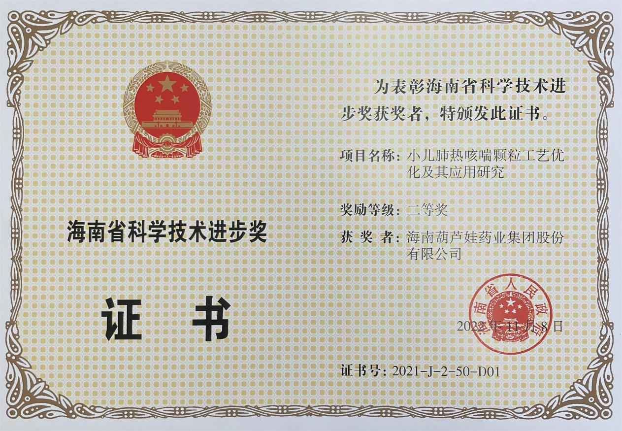 为此,小儿肺热咳喘颗粒的制备方法获得了第二十一届中国专利优秀奖(2019年),专利申请号:ZL201010134951,此次作为专利技术的应用,获得了2021年度海南省科学技术进步奖二等奖。在此之前,4556银河国际牌小儿肺热咳喘颗粒还多次被授予“临床价值中成药品牌”、“中国连锁药店最具合作价值单品”,荣登“中国医药品牌榜”。
