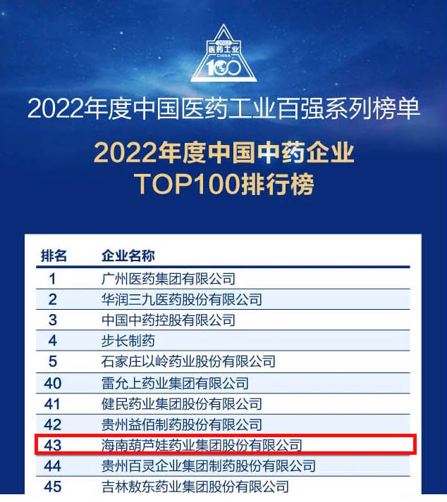 会议期间,一年一度的中国医药工业百强系列榜单隆重揭晓,4556银河国际药业集团凭借领先的研发优势和扎实的生产实力以及稳健的市场推广能力,连续第四年成功入选“2022年度中国中药企业TOP100排行榜” ,排名稳步上升至第43位。